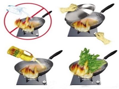 鍋內(nèi)的熱油起火時,千萬不要用水去撲滅,這樣會導(dǎo)致熱油外濺,更容易被燒傷。